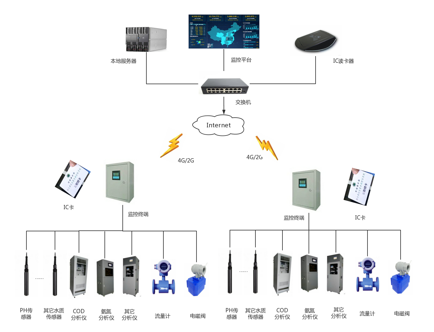 本系统是由污水排放监测点、监测中心站组成的污水监测系统。在线监测系统是一套以在线自动分析仪器为核心,运用现代传感器技术、自动测量技术、计算机应用技术以及相关专业分析软件和通讯网络所组成的综合性的在线自动监测体系,该系统可实现对企业废水和城市污水的自动采样、流量的在线监测和主要污染因子的在线监测;实时掌握企业及城市污水排放情况及污染物排放总量,监测信息传至环保局,由环保局对企业进行监督管理。与传统的污水处理技术相比,在线监测系统能够实现全程自动化运行,而减少人工的帮助,不仅节约了大量的人力物力,降低了运行成本,而且缩短了监测时间,实现了污水监测的实时化。